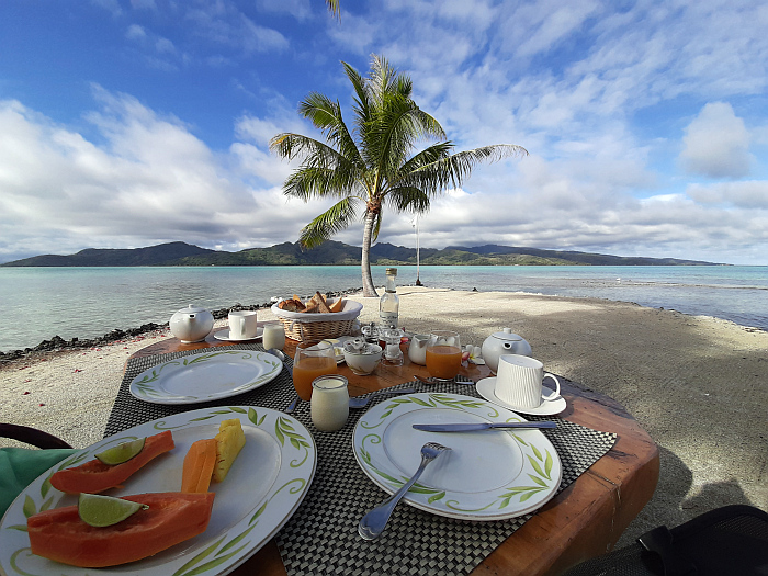 Taha´a, Vahine Island, snídaně na pláži.